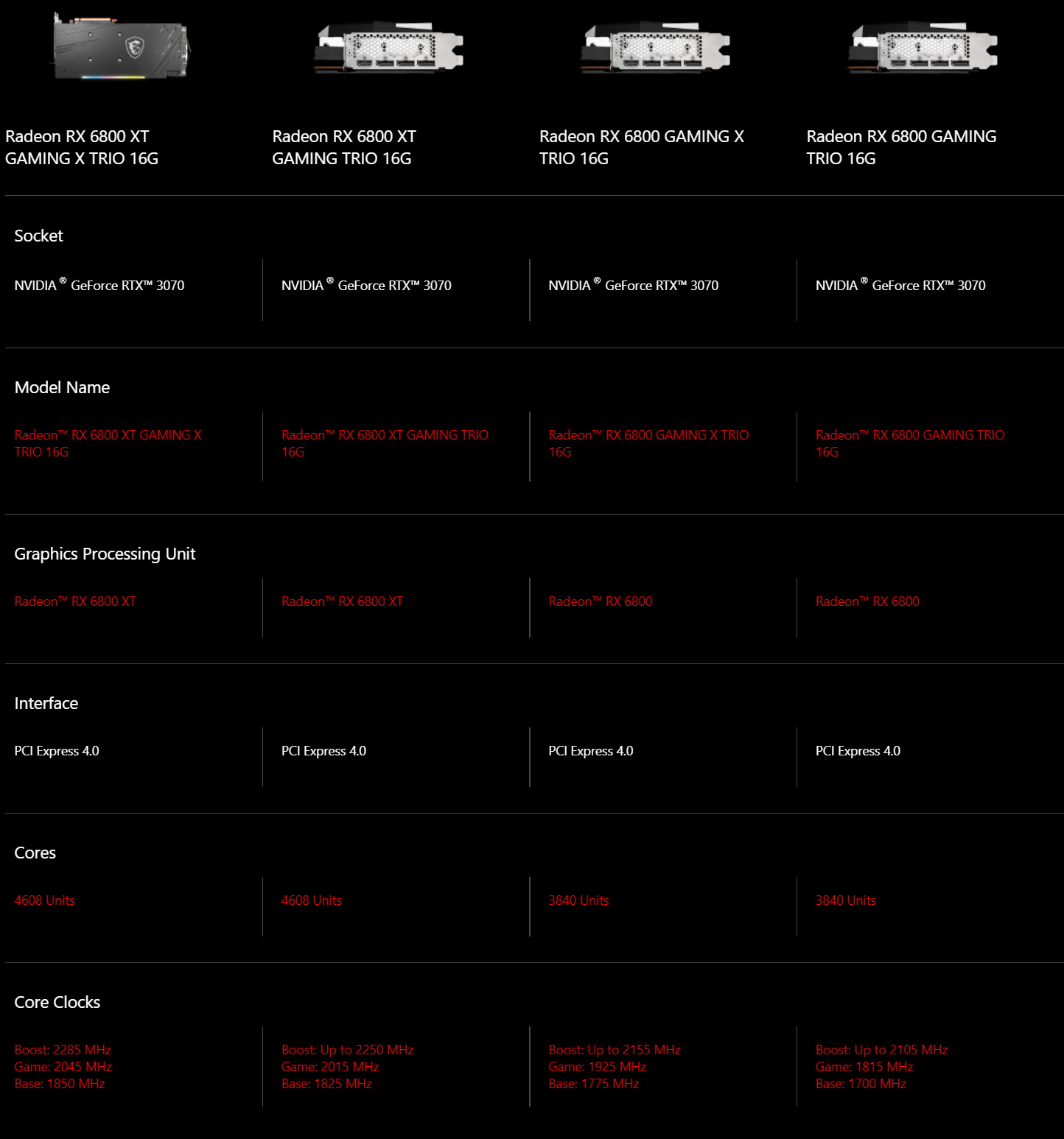 Официальные продажи эталонных версий видеокарт Radeon RX 6800 и RX 6800 XT уже начались, а это значит, что партнёры компании AMD в ближайшее время начнут массово анонсировать свои неэталонные решения на их основе, которые, как ожидается, поступят в продажу на следующей неделе. Одной из первых стала Micro-Star International (MSI), анонсировавшая модели Radeon RX 6800 XT и RX 6800 в исполнениях Gaming X Trio и Gaming Trio. Источник изображений: MSI
