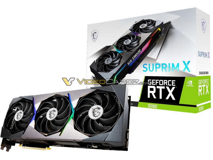 В распоряжении ресурса VideoCardz оказалась информация о технических характеристиках графических ускорителей GeForce RTX 3090 и RTX 3080 от компании MSI в новом флагманском исполнении Suprim. По части рабочих частот графических процессоров новинки соответствуют показателям моделей серии Aorus Xtreme от компании Gigabyte. Обе видеокарты MSI оснащены двойной системой BIOS с тихим и производительным режимами работы. Для обоих режимов заявляются одинаковые показатели частот работы графических процессоров в Boost-режиме. Например, для модели MSI GeForce RTX 3090 Surpim X этот показатель составляет 1860 МГц, а для младшей версии GeForce RTX 3080 Suprim X — 1905 МГц.